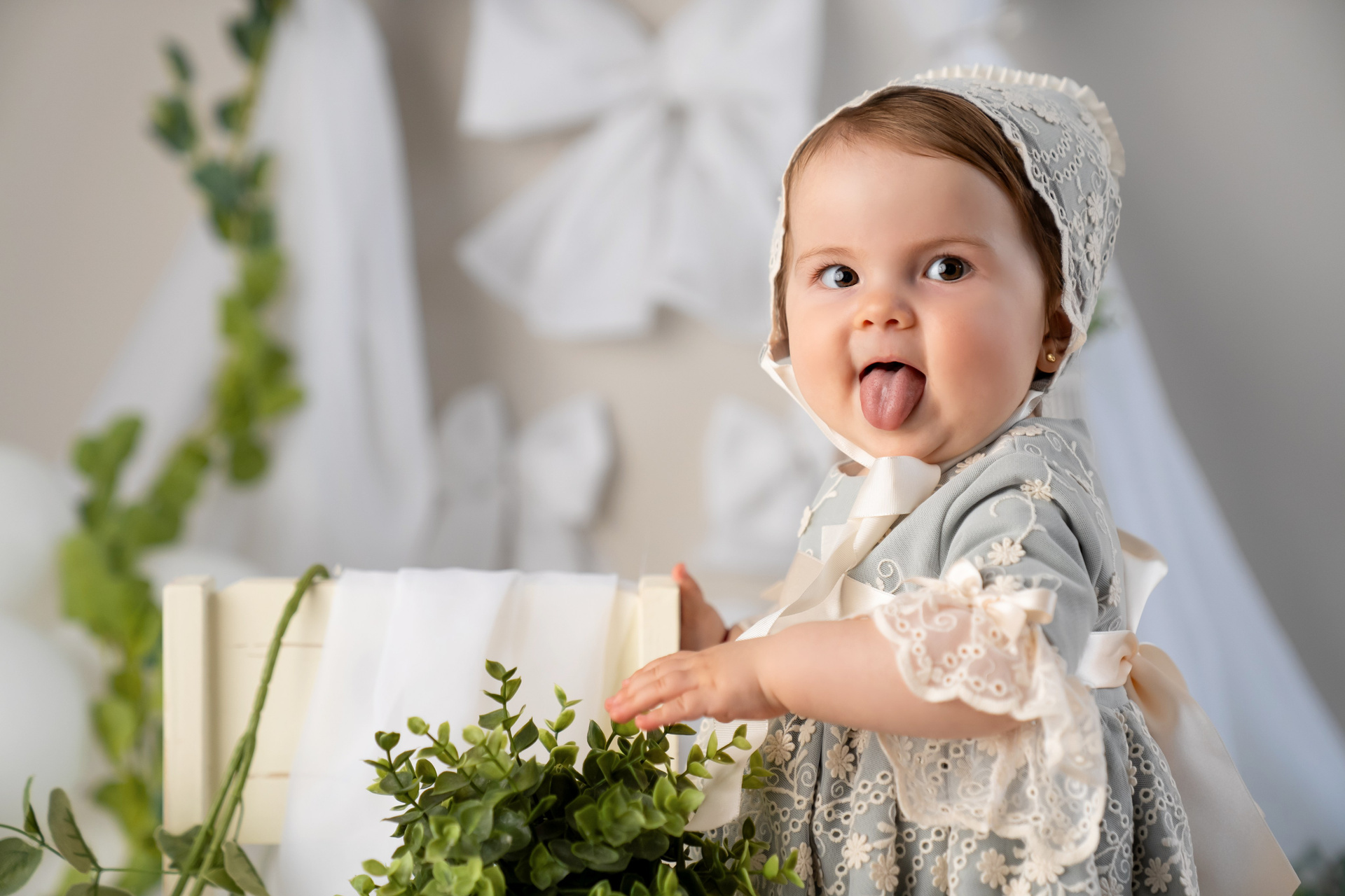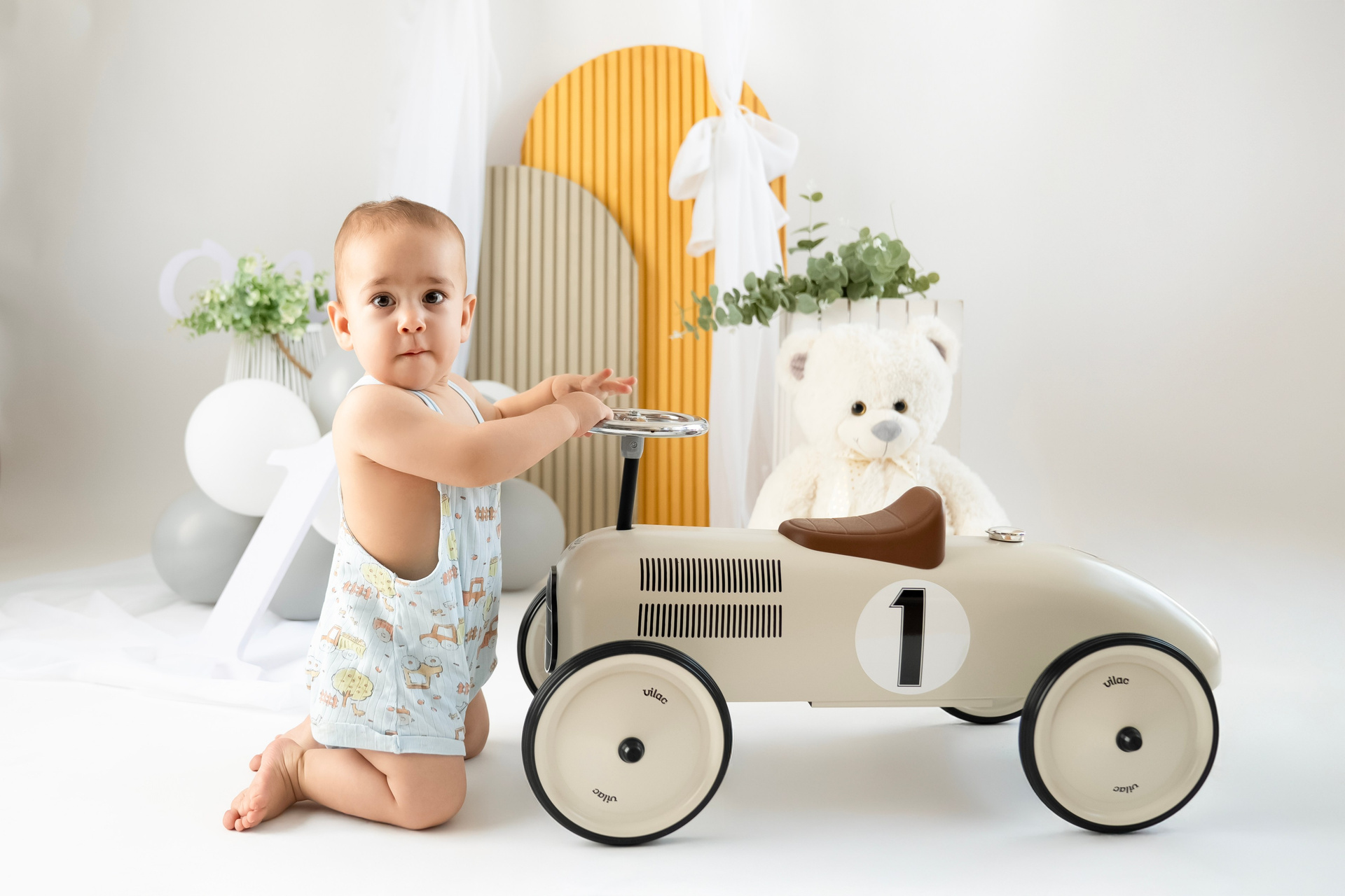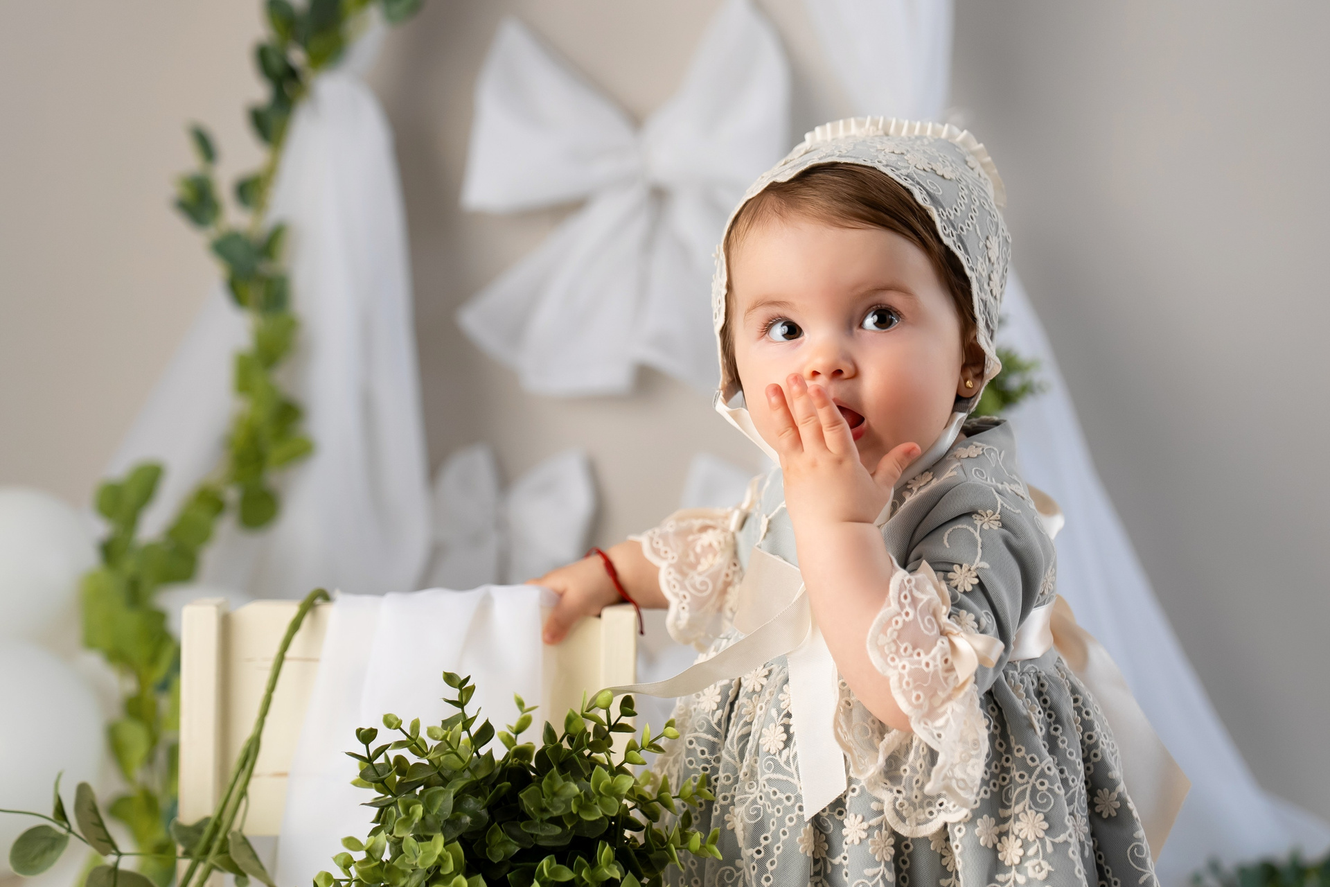 Primero le hacemos unas cuantas fotos bonitas en su escenario en una sillita o una cama sentado.