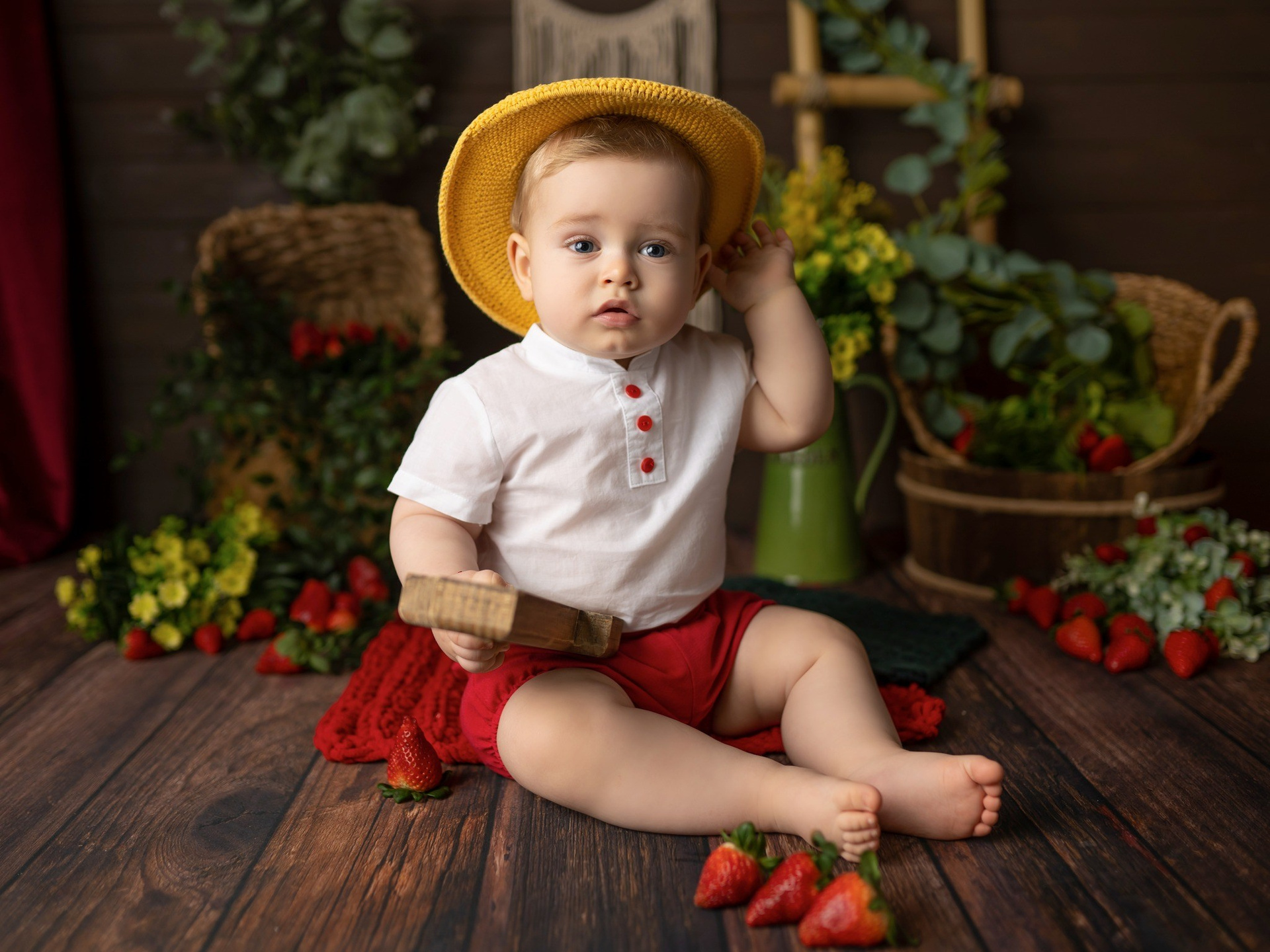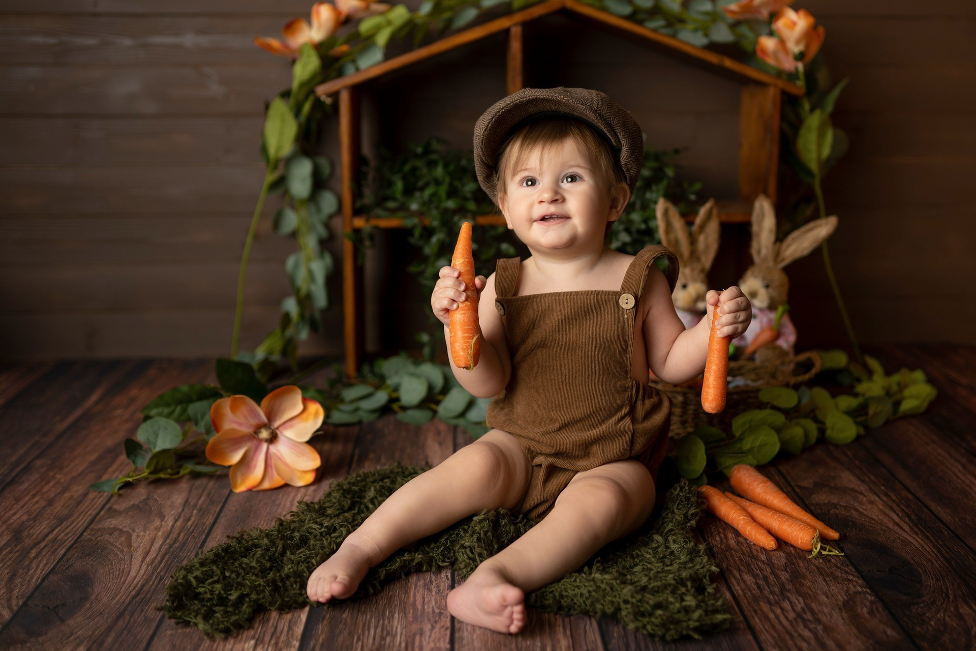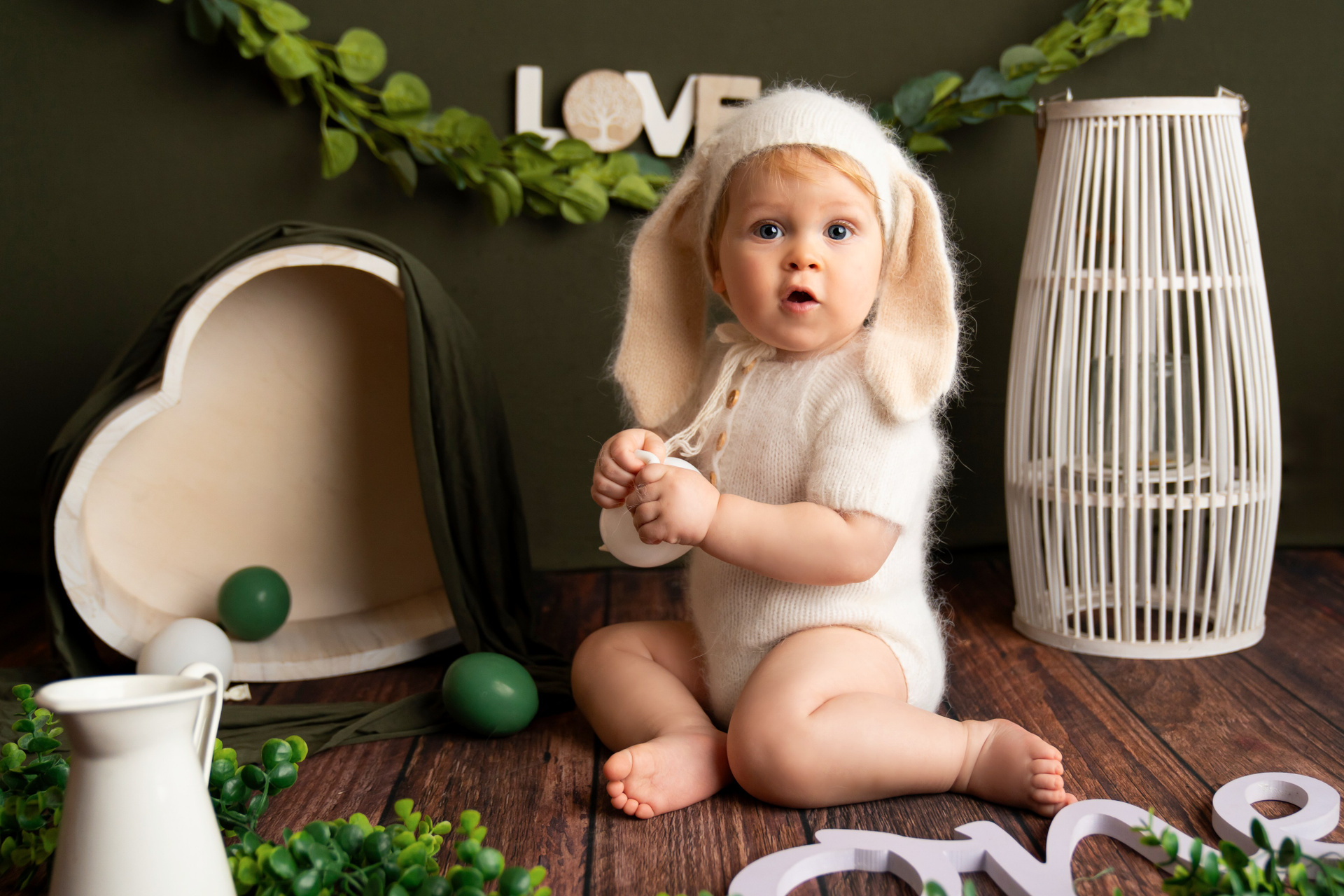 Primero le hacemos unas cuantas fotos bonitas en su escenario en una sillita o una cama sentado.